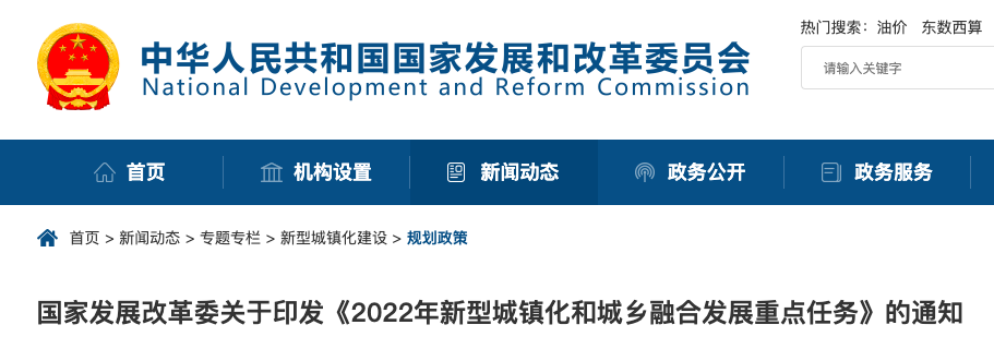 中央和国家机关有关部门、有关直属机构,各省、自治区、直辖市及计划单列市、新疆生产建设兵团发展改革委,全国工商联,中国国家铁路集团有限公司、国家开发银行、中国农业发展银行:经城镇化工作暨城乡融合发展工作部际联席会议第四次会议审议通过,现将《2022年新型城镇化和城乡融合发展重点任务》印发给你们,请认真贯彻执行。