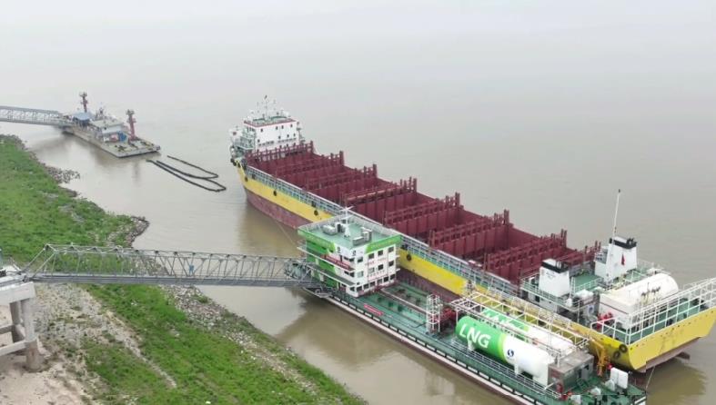 “湘水运27号轮”在岳阳港云溪港区天然气加注站加气。
